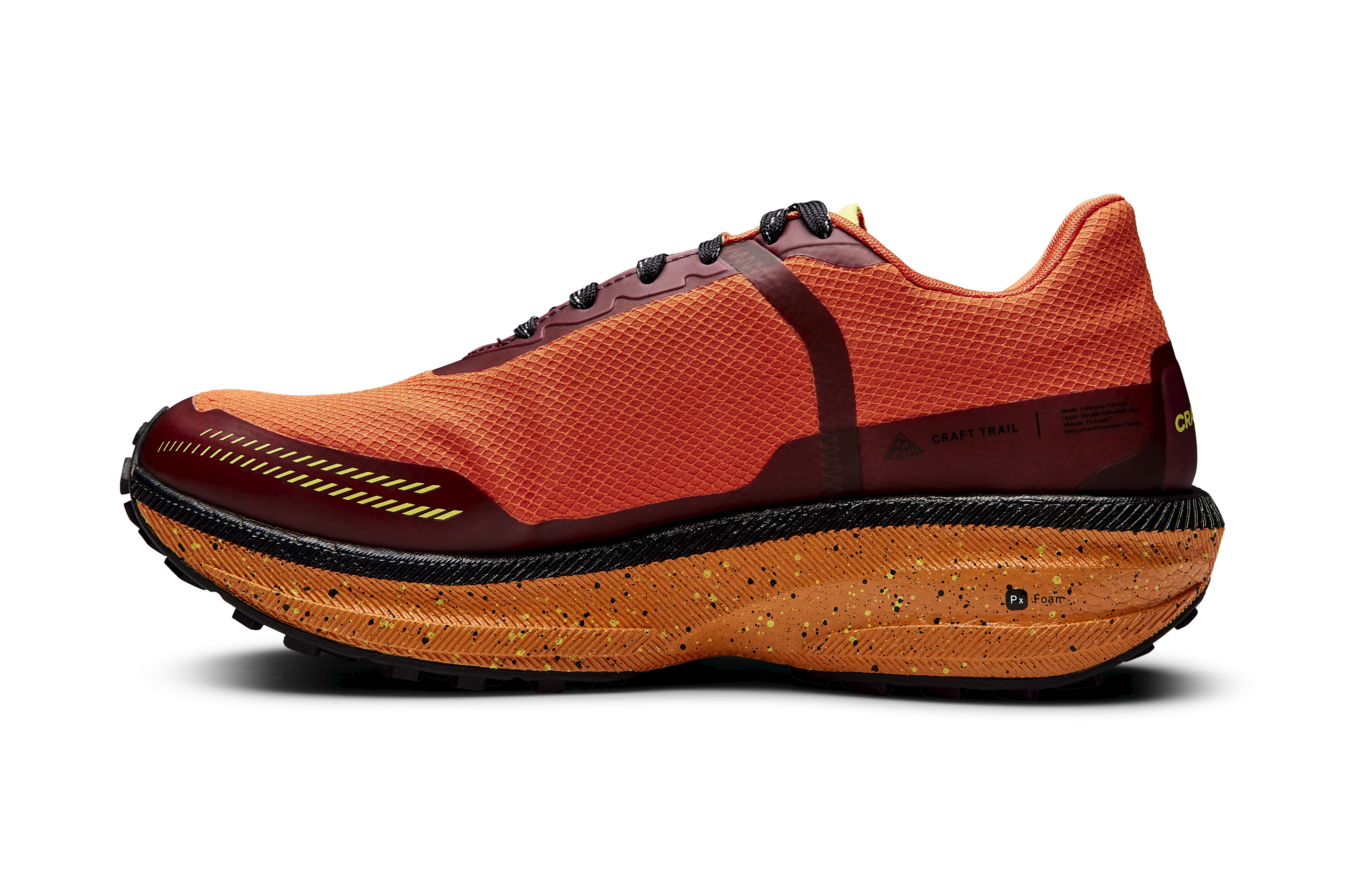 The midsole with Px Foam™ is designed for explosive toe-off and soft landing with every step. The mid-height sole provides excellent grip on moderate terrain as well as on the road and anything in between. Every part of this new shoe has been carefully designed to provide maximum energy across various terrains. Endurance Trail Hydro delivers pure performance on the trail while maintaining a simple design.Material: upper - 100% polyester + seamless TPU, midsole - 100% TPU foam, outsole - 100% rubber