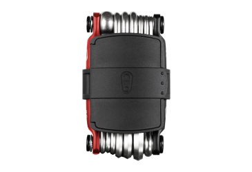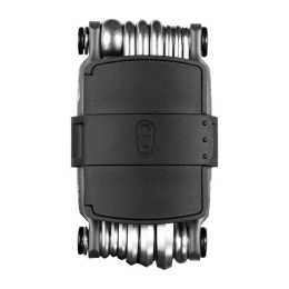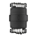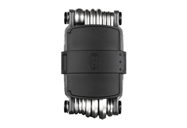 Lightweight 20-function tool with integrated wicker for repairing tubeless tyres and a storage compartment that contains spare wicks and a place for a quick chain coupler.