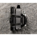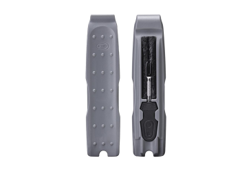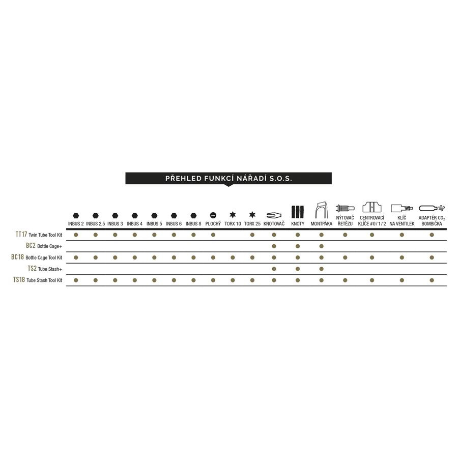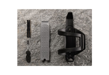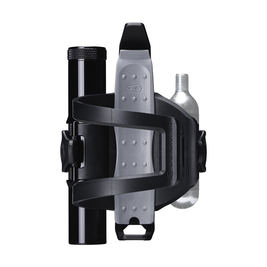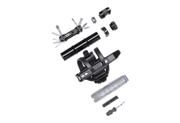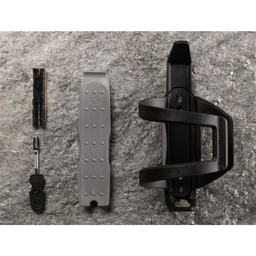 Basket with easily adjustable entry on the left or right side with an integrated tire lever, wicking tool, and spare wicks. In the side storage compartment, there is space for a large multifunctional tool, and on the other side of the basket, you can attach a CO2 cartridge or a mini pump.