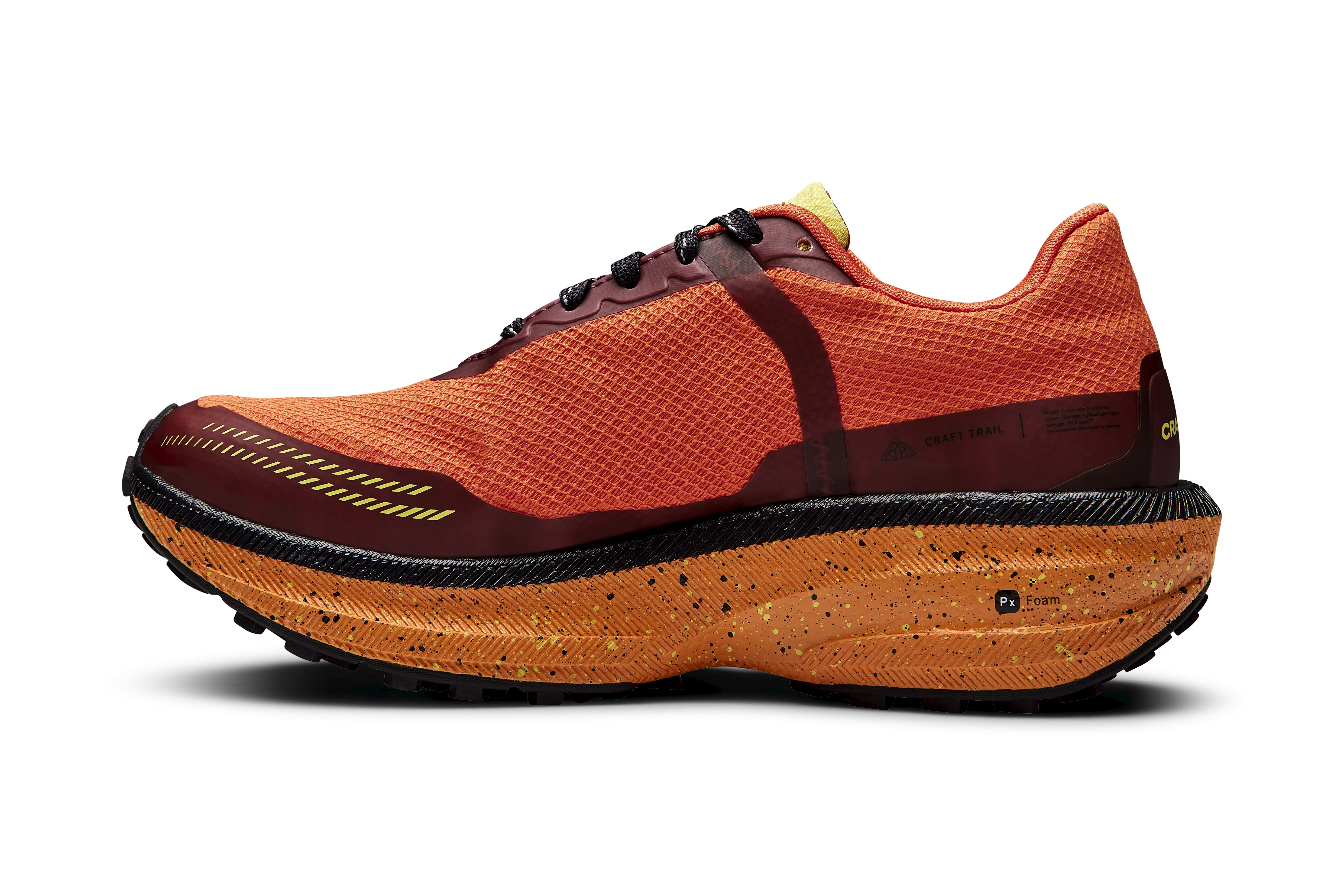 The midsole with Px Foam™ is designed for explosive toe-off and soft landing with every step. The mid-height sole provides excellent grip on moderate terrain as well as on the road and anything in between. Every part of this new shoe has been carefully designed to provide maximum energy across various terrains. Endurance Trail Hydro delivers pure performance on the trail while maintaining a simple design.Material: upper - 100% polyester + seamless TPU, midsole - 100% TPU foam, outsole - 100% rubber